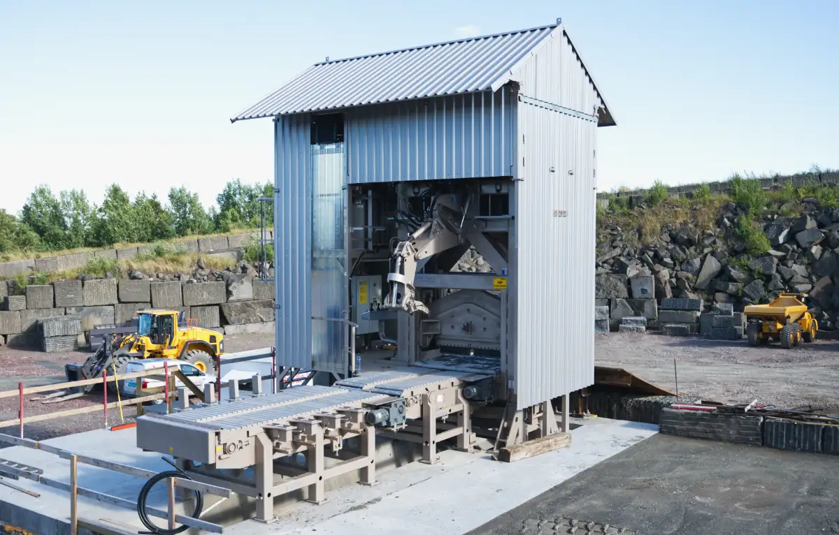 - works in cooperation with a wheel loader, which pushes the stone into the machine and the operator splits it by remote control