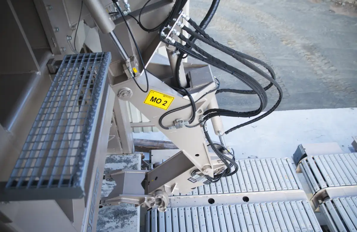 Thanks to the MO 2 manipulators with proportional valves for sensitive control, which have 3 parts and 4 joints (excellent kinematics), you can easily turn and tilt the stone in all directions in combination with the double-belt conveyor.
