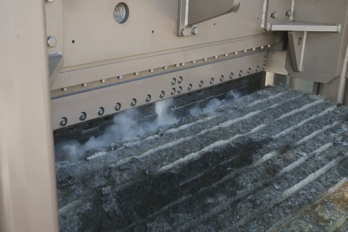 When splitting large blocks, small waste falls down the machine and conveyors into a channel where it is continuously removed. This minimizes unproductive cleaning time and prevents potential damage to the machine from accumulated waste.